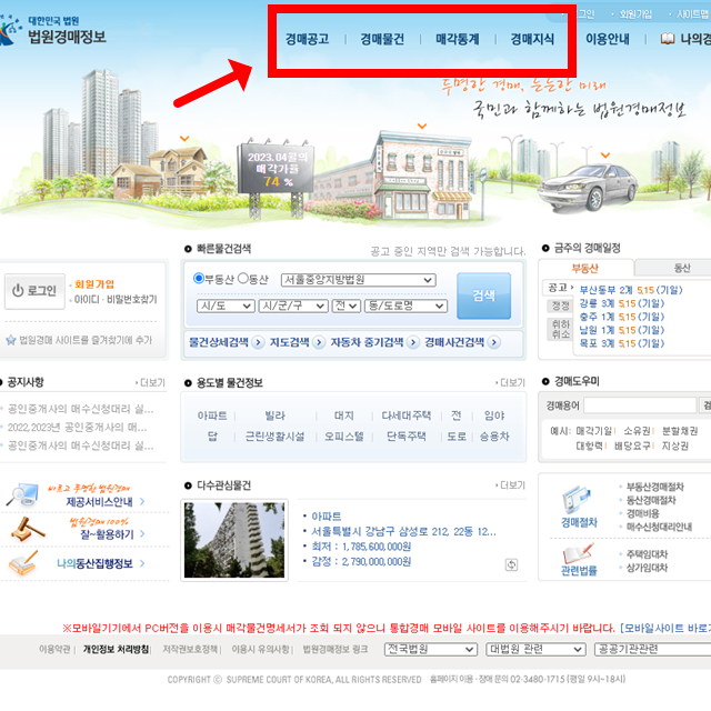크게 살펴볼 메뉴는 홈페이지 상단에 경매공고, 경매물건, 매각통계, 경매지식 등이 있는데요. 각각의 정보를 확인해 보겠습니다.