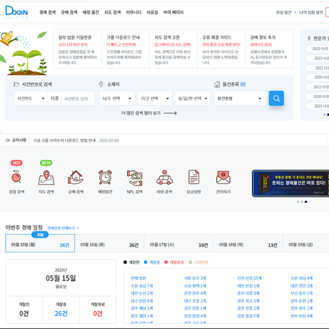 두인경매는 경매와 공매를 한 사이트에서 검색해 볼 수 있고 무료버전으로 초보 경매자도 한눈에 볼 수 있도록 편리하게 되어 있다는 장점이 있습니다. 또 지역, 사건번호, 물건종류, 특수경매 등의 물건도 확인 가능하며 선순위 임차인, 도로인접 정보 등도 편리하게 확인할 수 있습니다.
