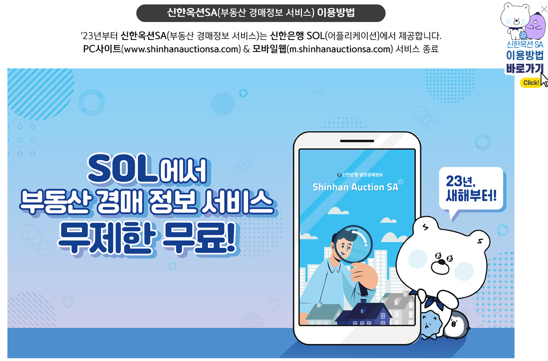 2023년부터 신한 SA(부동산 경매정보 서비스)는 신한은행 SOL 어플에서 제공합니다.