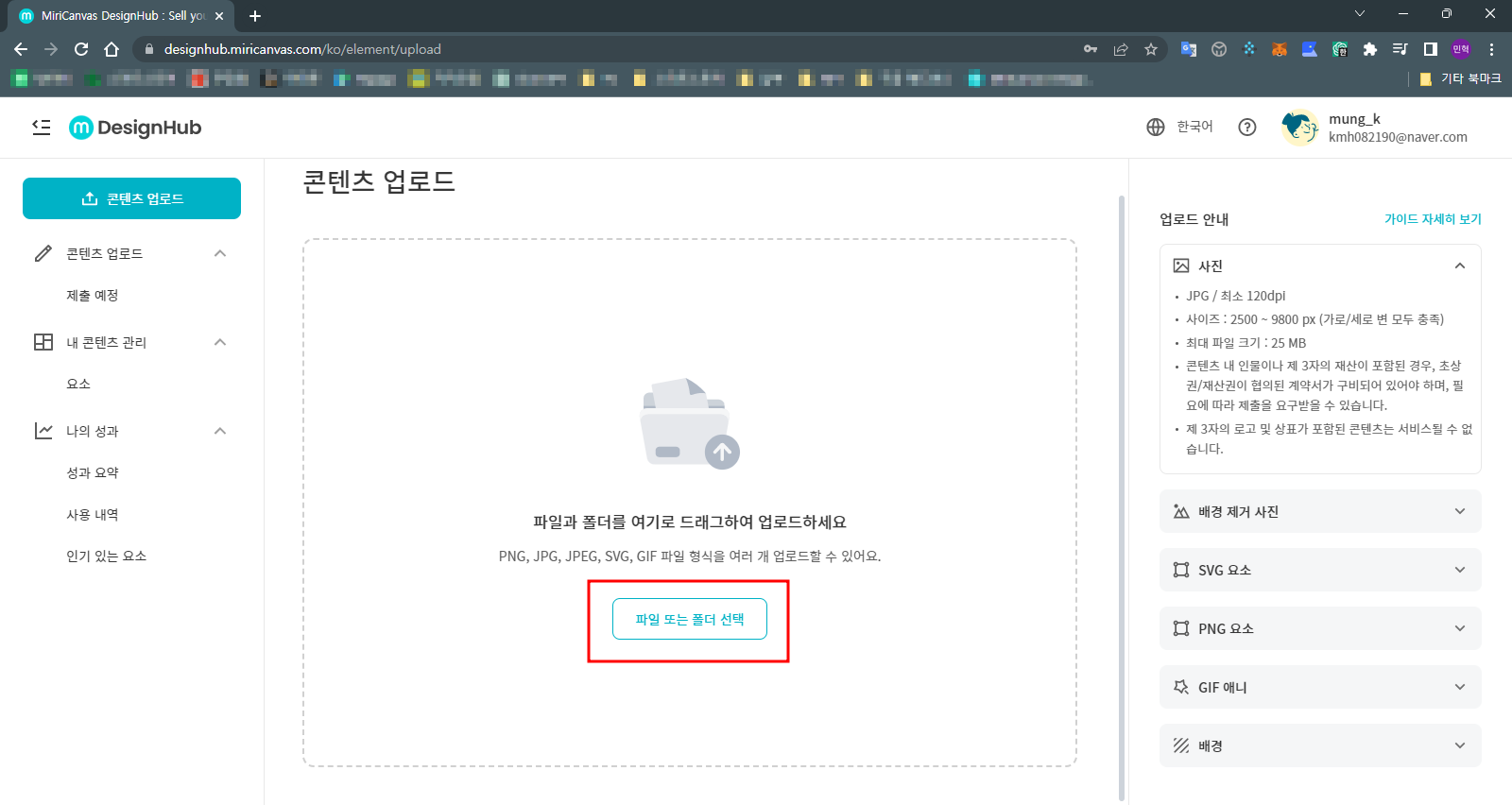 1. 로그인을 하면 '콘텐츠 업로드' 창이 뜨게 되는데 여기서 '파일 또는 폴더 선택' 클릭