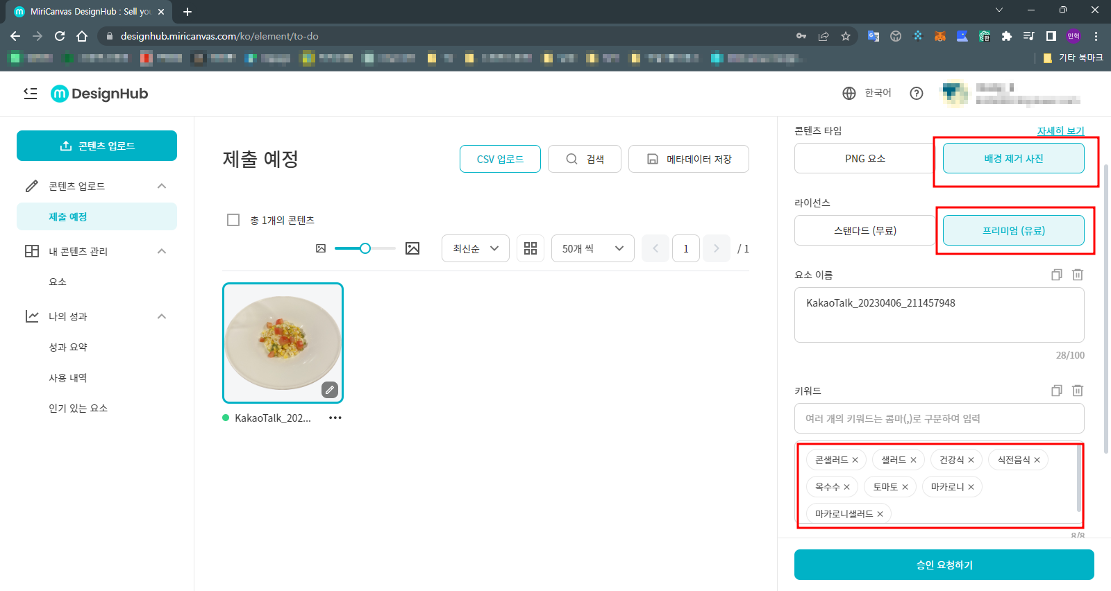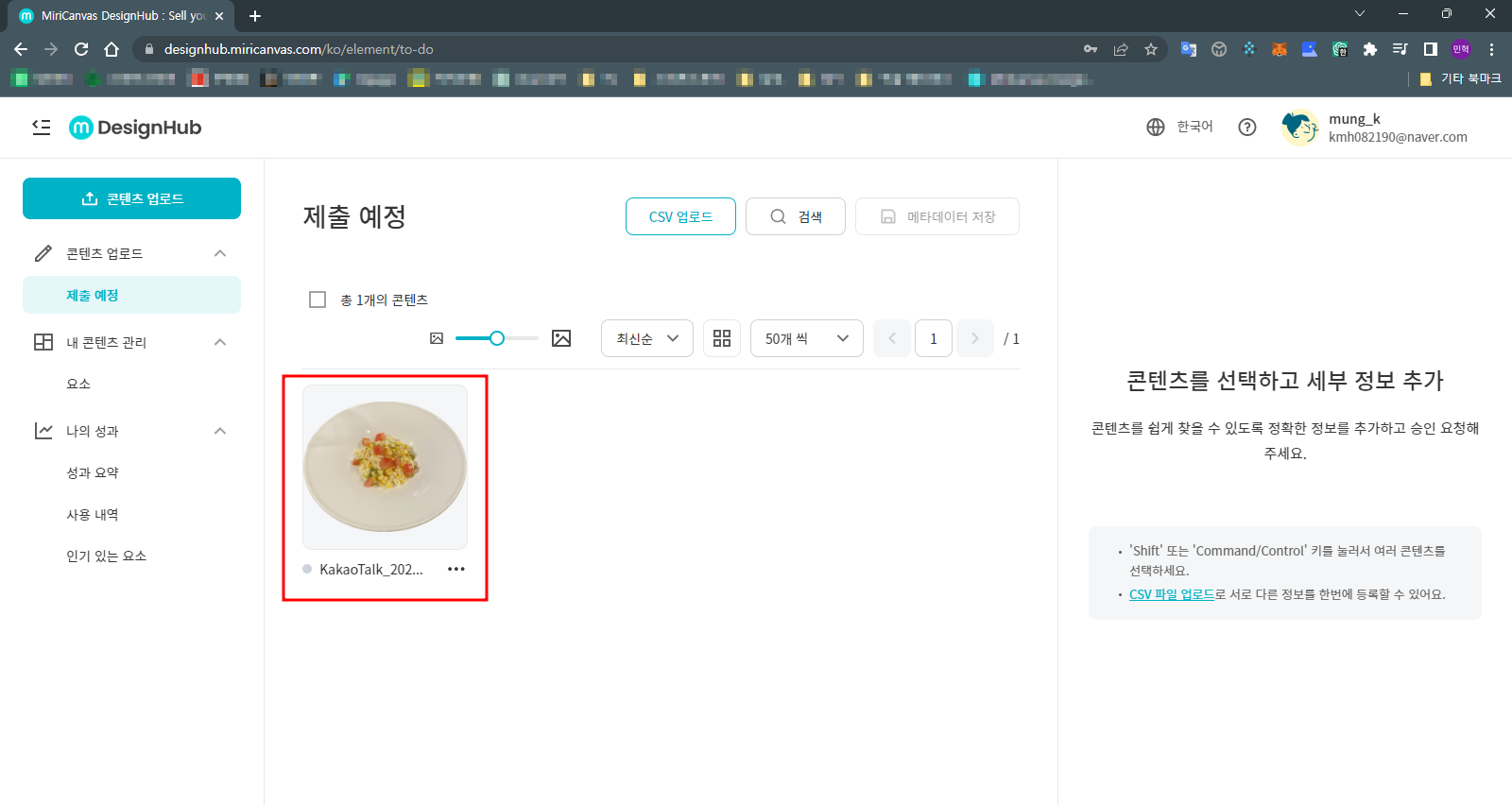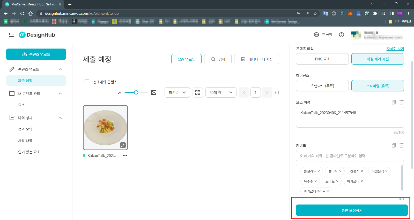 -우측 상단에 '1개의 콘텐츠가 제출되었습니다.' 라고 뜨면