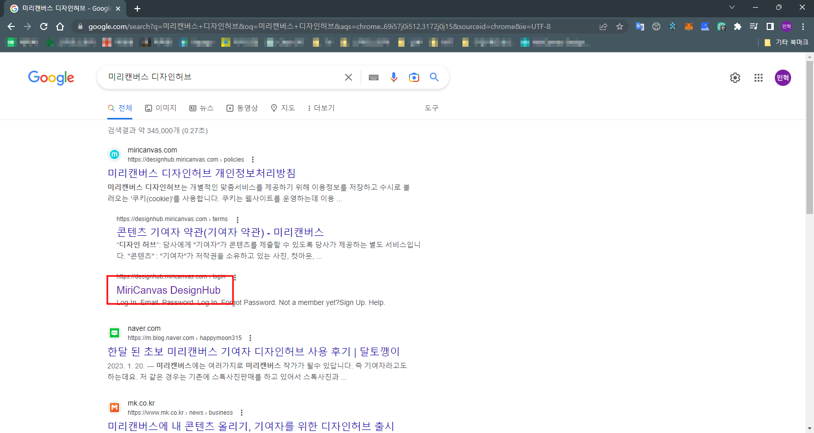 우선 구글 검색창에 '미리캔버스 디자인허브' 를 검색하고 아래의 빨간색 네모 링크에 들어갑니다.