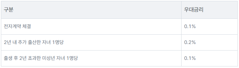 - 대상 : 대출신청일 기준 2년 내 출산(2023년 1월 1일 이후 출생아부터 적용)한 무주택 세대주 및 1 주택 세대주