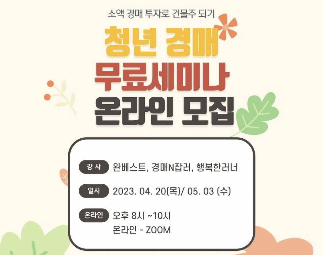저도 부동산 경매 세계에서 성공하는 데 필요한 지식과 자신감을 얻고자 이 세미나에 신청했습니다. 항상 관심은 있었는데 어떻게 시작해야 할지 막막했기 때문에 책도 몇 권 사서 읽어봤는데 사실 감이 잘 오지 않더라고요. 그러던 차에 부동산 투자 무료 세미나가 있다는 것을 보게 되었고, 망설임 없이 신청하게 되었습니다.