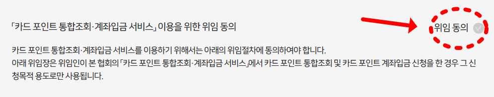 4. 다음 [카드 포인트 통합조회·계좌입금 서비스] 이용을 위한 위임 동의를 한 뒤 [카드포인트 계좌입금] 항목 클릭하면
