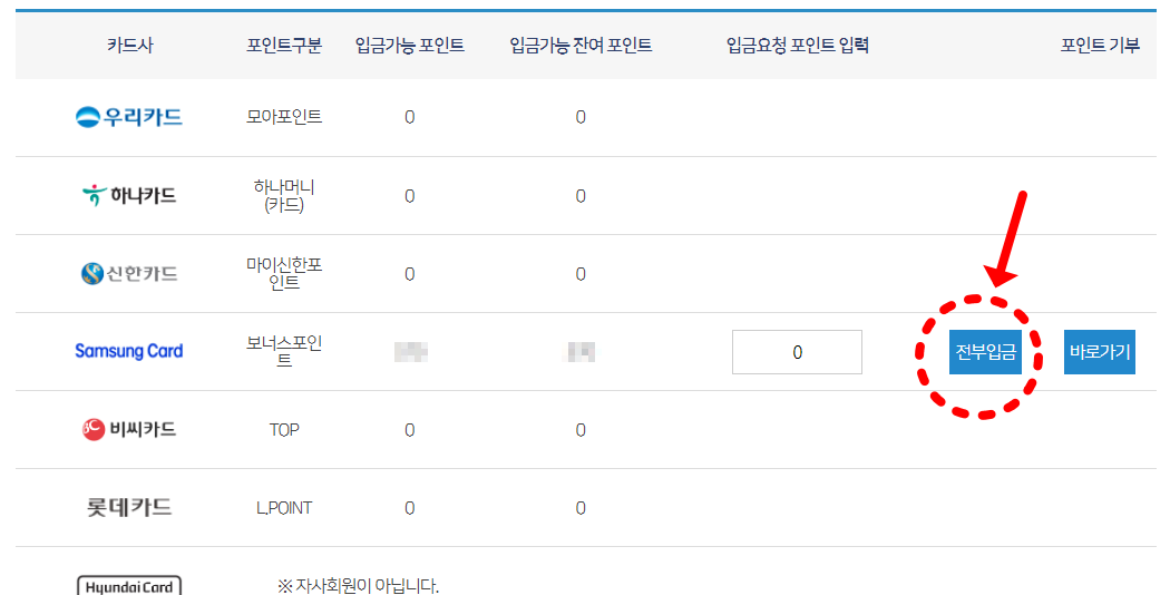 5. 내가 가지고 있는 카드의 포인트가 조회가 됩니다. [전부입금] 을 누르시고 현금으로 받을 계좌정보를 입력하면 끝!