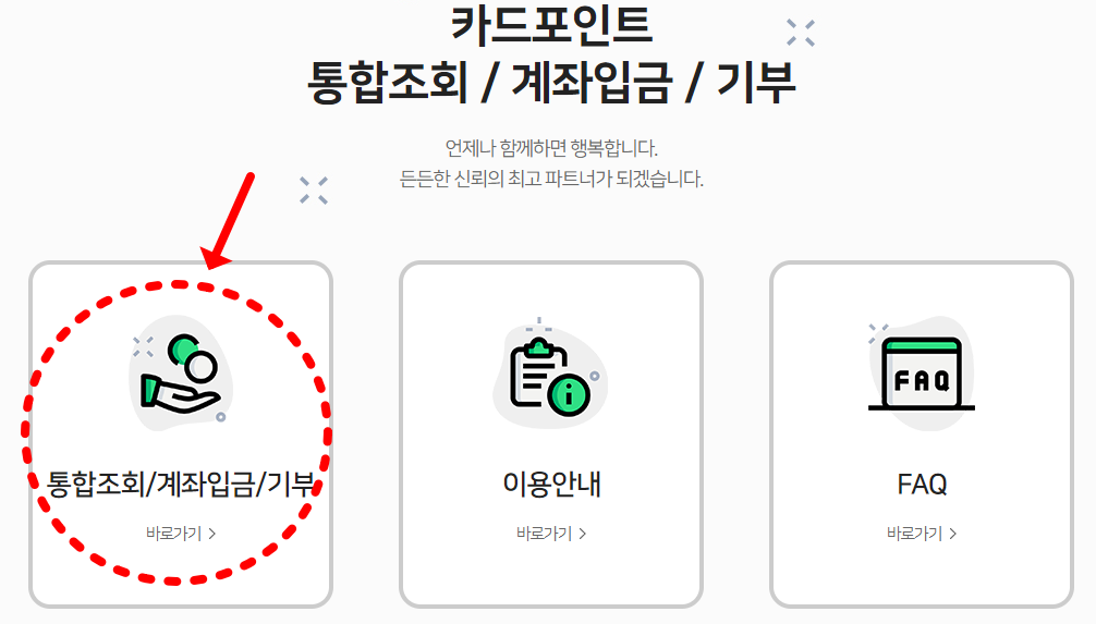 1. 위 링크를 통해 여신금융협회 홈페이지에 접속하시면 [카드포인트 통합조회/계좌입금/기부] 항목이 나옵니다.