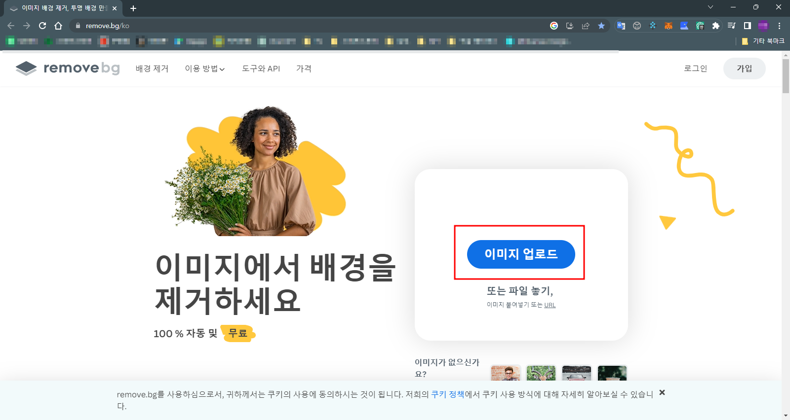 2. '이미지 업로드' 클릭 후 배경을 지우고 싶은 사진 선택