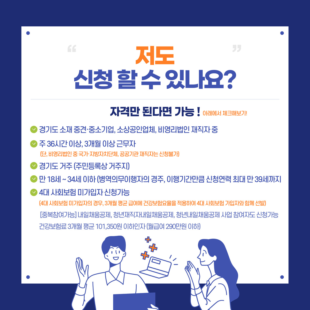 -근무조건 : 경기도 소재 중견.중소기업, 소상공인업체, 비영리법인 재직자 중 주 36시간 이상, 3개월 이상 근무자