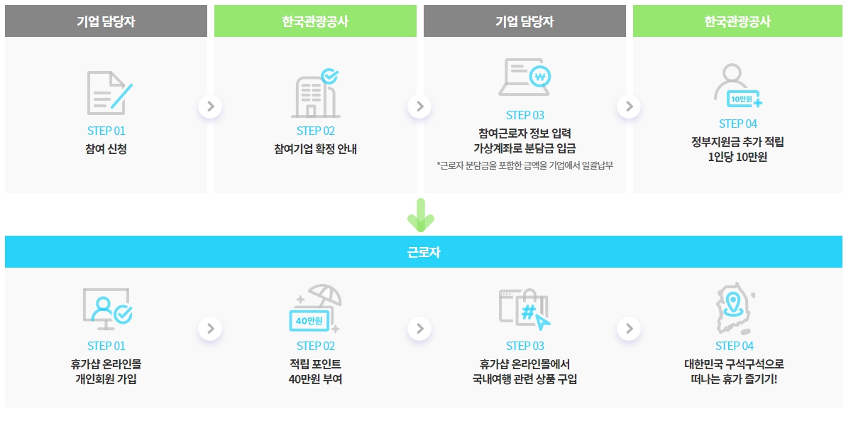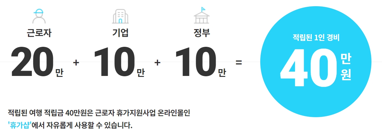 근로자의 혜택은 기업(10) + 정부(10) = 20만원의 휴가비를 지원 받을 수 있습니다.