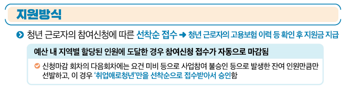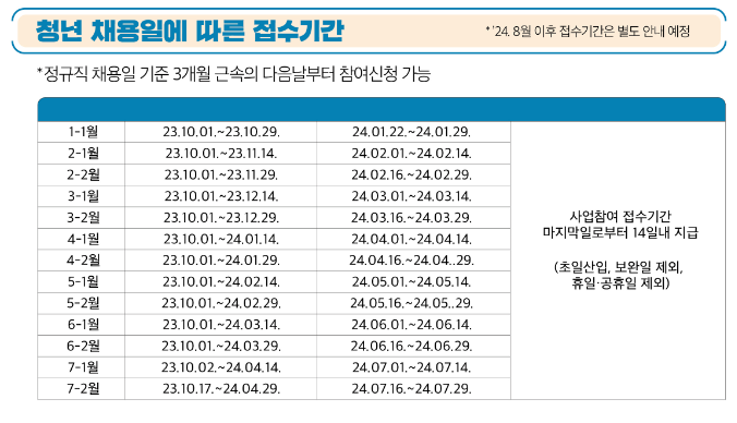 - 2023년 10월 1일 ~ 2024년 9월 30일 기간에 제조업 등 빈일자리 중소기업에 정규직으로 취업한 만 15세~34세 이하 청년이 신청 가능합니다.