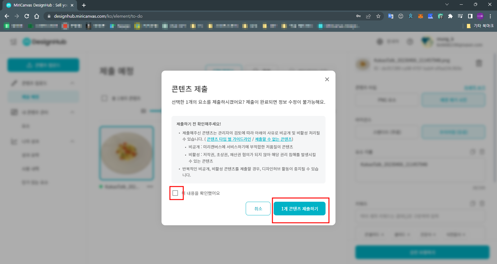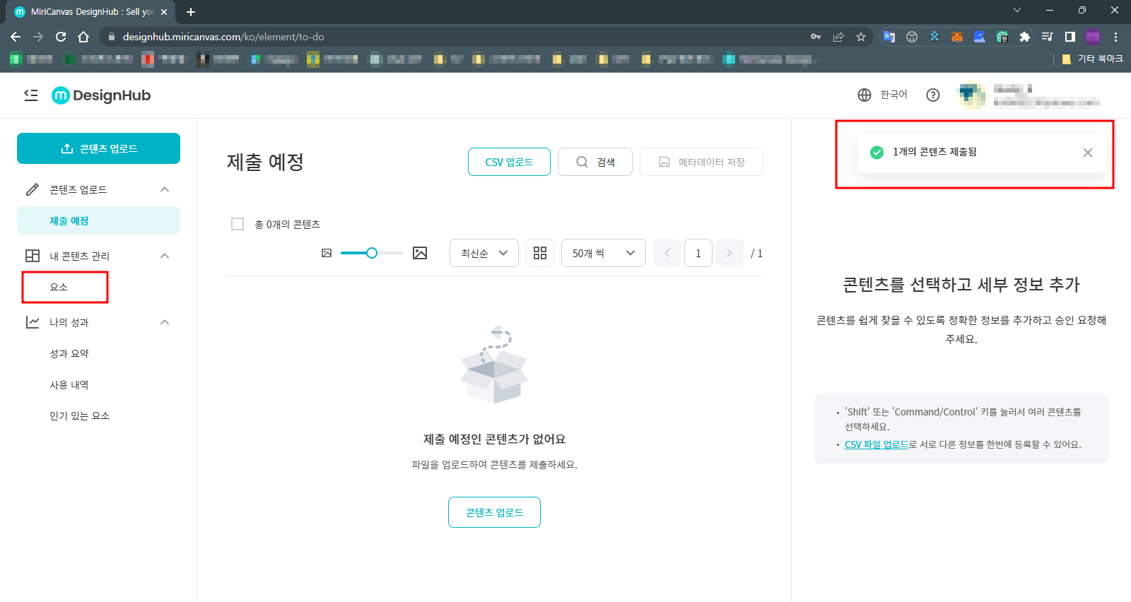 -우측 상단에 '1개의 콘텐츠가 제출되었습니다.' 라고 뜨면