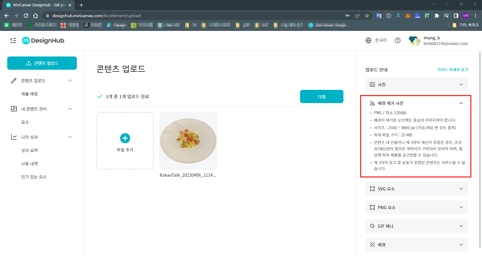 -PNG파일 규격에 맞춰 사진의 사이즈, 파일크기를 확인(우측 사이드바)